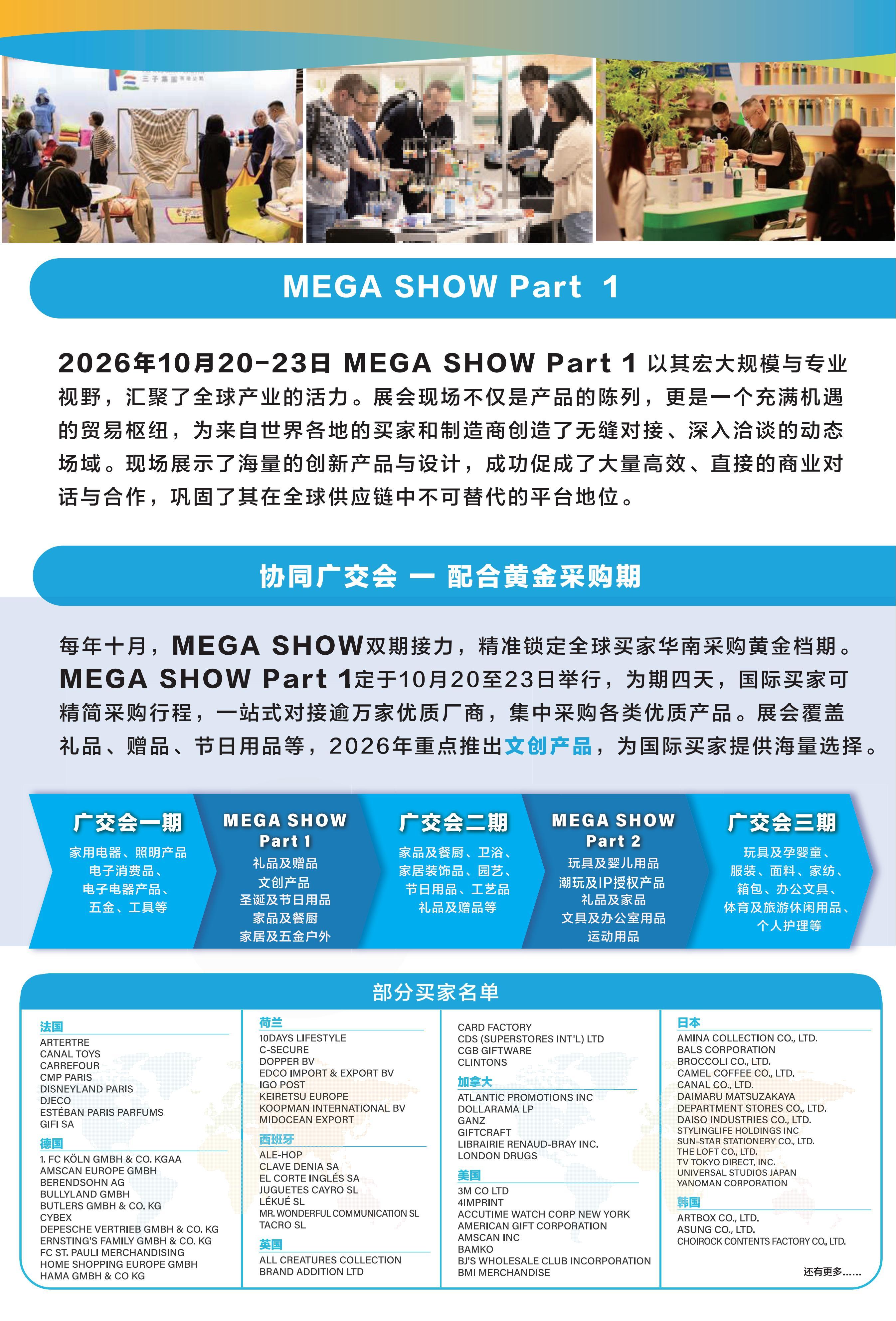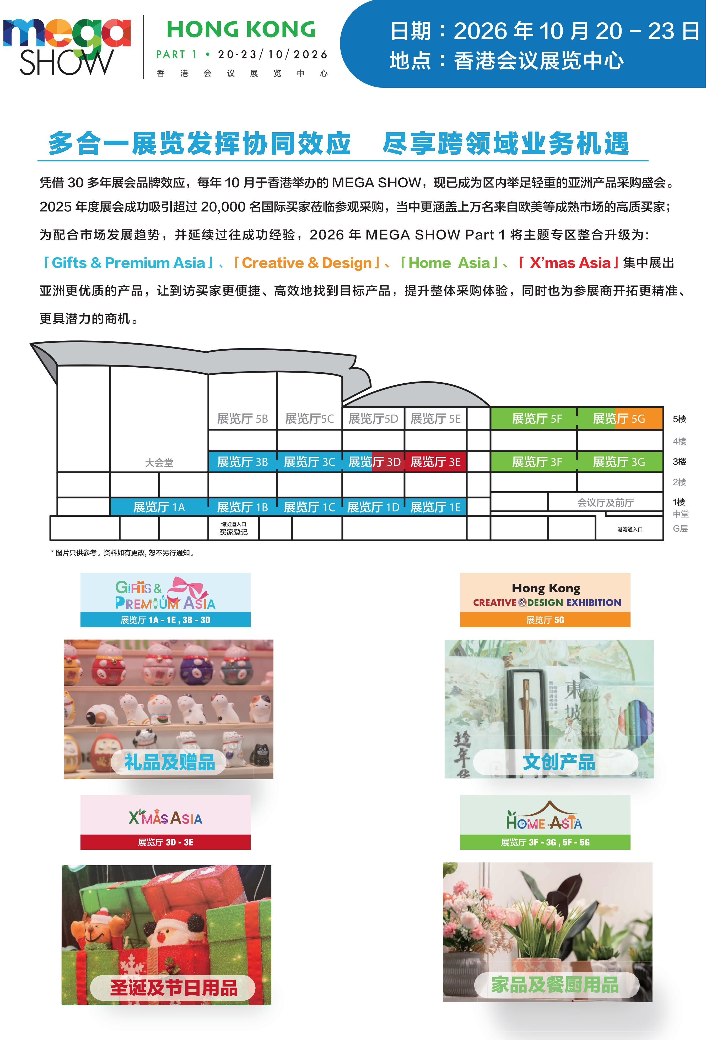 今年迈向第 33 届的首段 MEGA SHOW 展会系列将再度汇聚数千家来自亚洲及世界各地的厂商参展,展示林林总总的礼品、赠品、家品、家居装饰、餐厨用品、生活品味产品、玩具、婴儿用品、圣诞节日用品、户外用品及通讯配件赠品等。